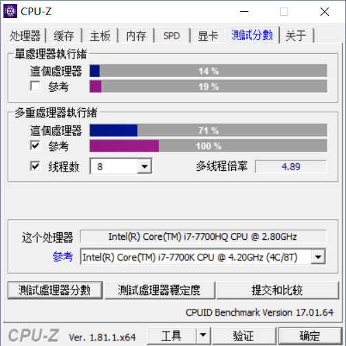 通过CPU-Z自带的性能测试来看,移动版i7-7700HQ较桌面级的i7-7700K整体性能要差上29%,而单核心性能而言仅仅是14%和19%的差距而已,这种级别的性能损失对于低功耗的移动版而言还是可以接受的。