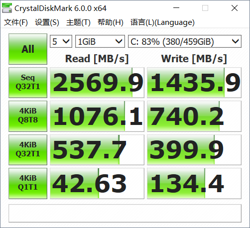 在前文笔者已经说过了三星SM961的强大,那么这一次的测试成绩更能印证这一点,在硬盘部分,重点是采用NVMe协议PCIe x 4的高速规格512G SSD固态硬盘,在CrystalDiskMark硬盘性能检测软件的测试结果来看,内置的SSD读取速度平均达到了2569.9MB/s,写入速度平均在1435.9 MB/s,成绩非常惊人,可以说是很多玩家梦寐以求的SSD读写速度了。