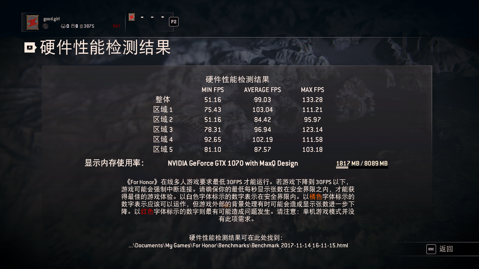 而在更偏向于动作类的《荣耀战魂》中,技嘉Aero 15X依旧获得了大幅超越60帧的表现,在冷兵器战斗中,玩家不需要经常移动镜头寻找敌人,而是通常在和敌人硬碰硬比拼操作功力,因此只要能保证60帧以上对于玩家来说都是完全足够的。
