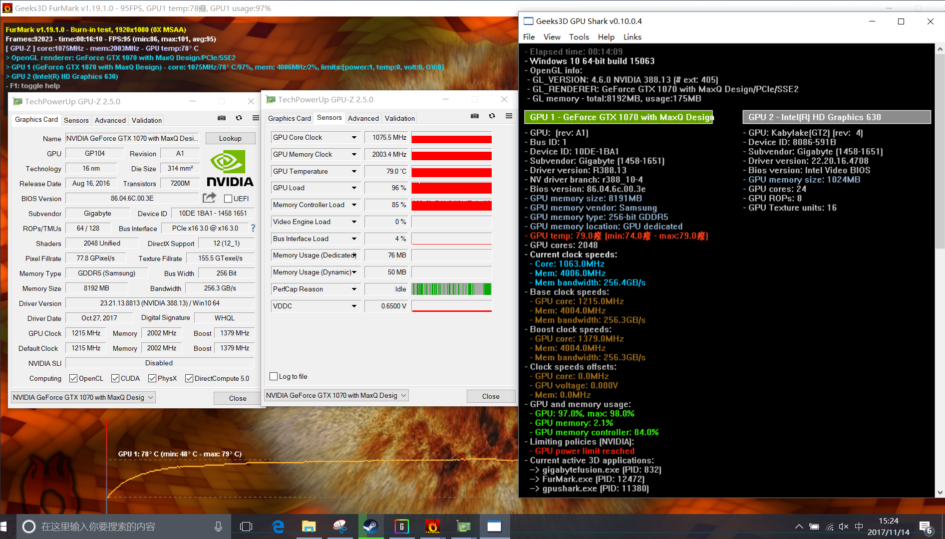 温度测试部分,首先在很多玩家耳熟能详的FurMark甜甜圈跑分测试中,可以看到GPU的温度最终稳定在了78℃,而在温度设定方面,我们可以看到笔记本GPU的温度最高值锁定在了79℃,此时的频率接近1100MHz,通过有图也可以看到此时GPU已经撞到了功耗墙,这也是为了保护笔记本电脑硬件的一种方法,毕竟让显卡无限制的热下去就失去了MAX-Q的意义。