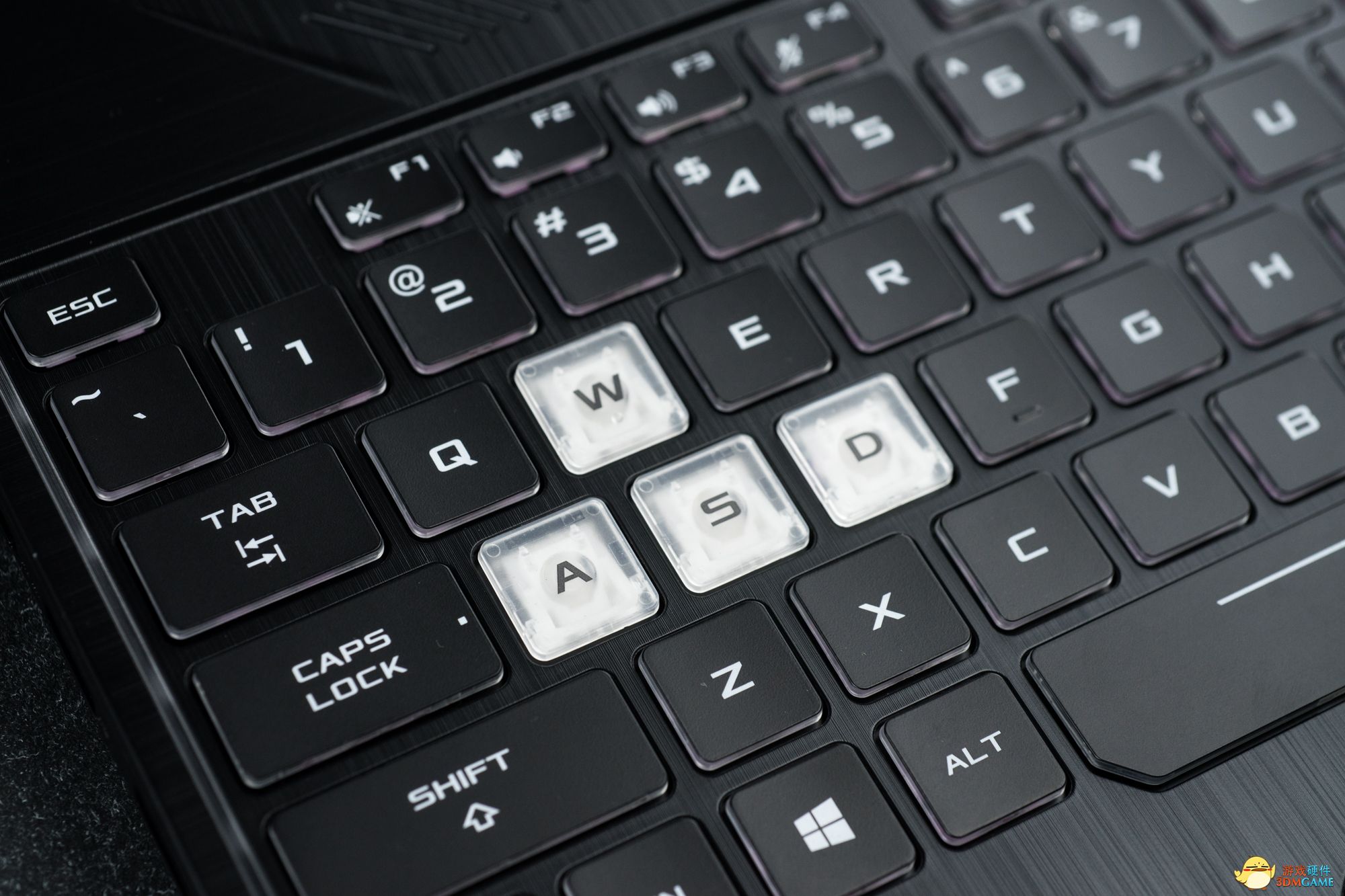 键盘WASD部分做成了透明键帽,在有意的强调着这台电脑的游戏本属性。键盘带有红色背光,但键帽本身不透光,红色灯光会在键冒侧边呈现出来。键盘自身的手感也是非常不错的,键程适中反馈明确,没有拖泥带水的感觉。