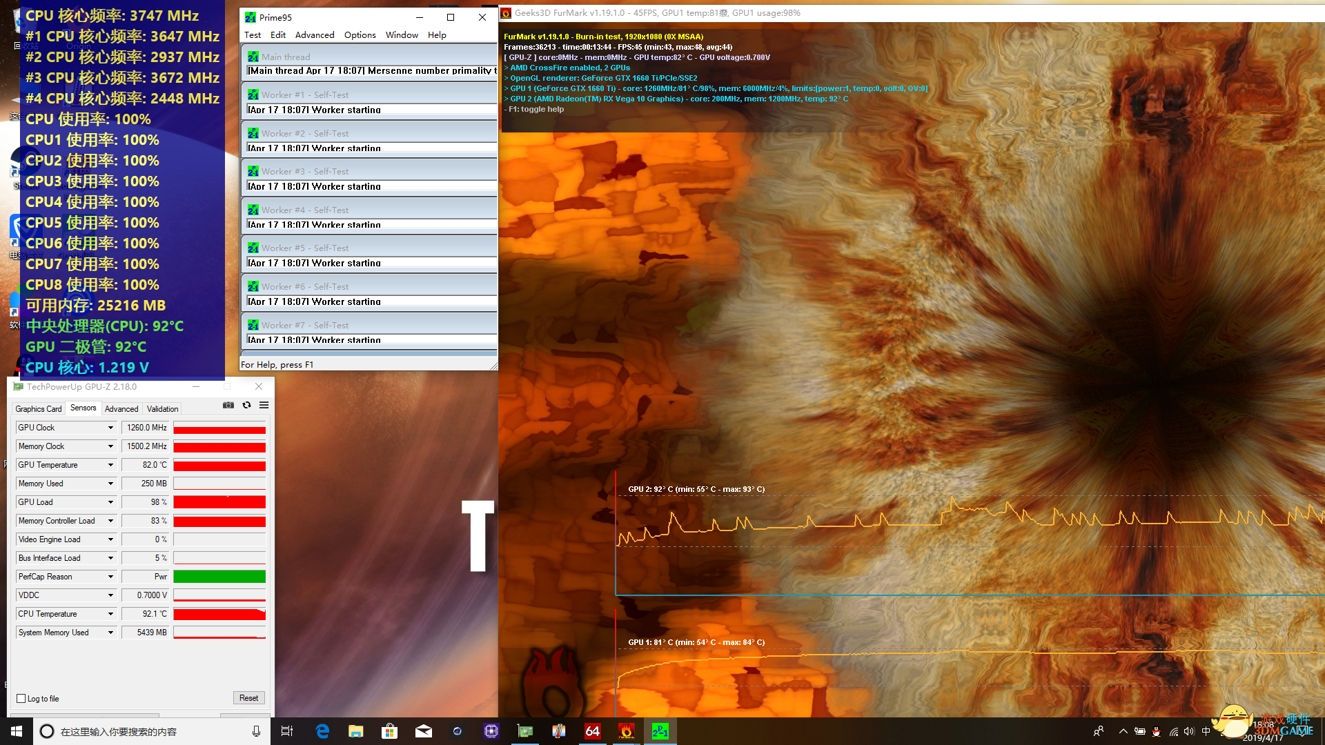 CPU+显卡双拷测试中,CPU温度最高92℃,频率有所下降,其中有两个核心降频略多一些;显卡温度可以保持在81℃,这个温度不算非常凉爽,还有一定的提升空间。
