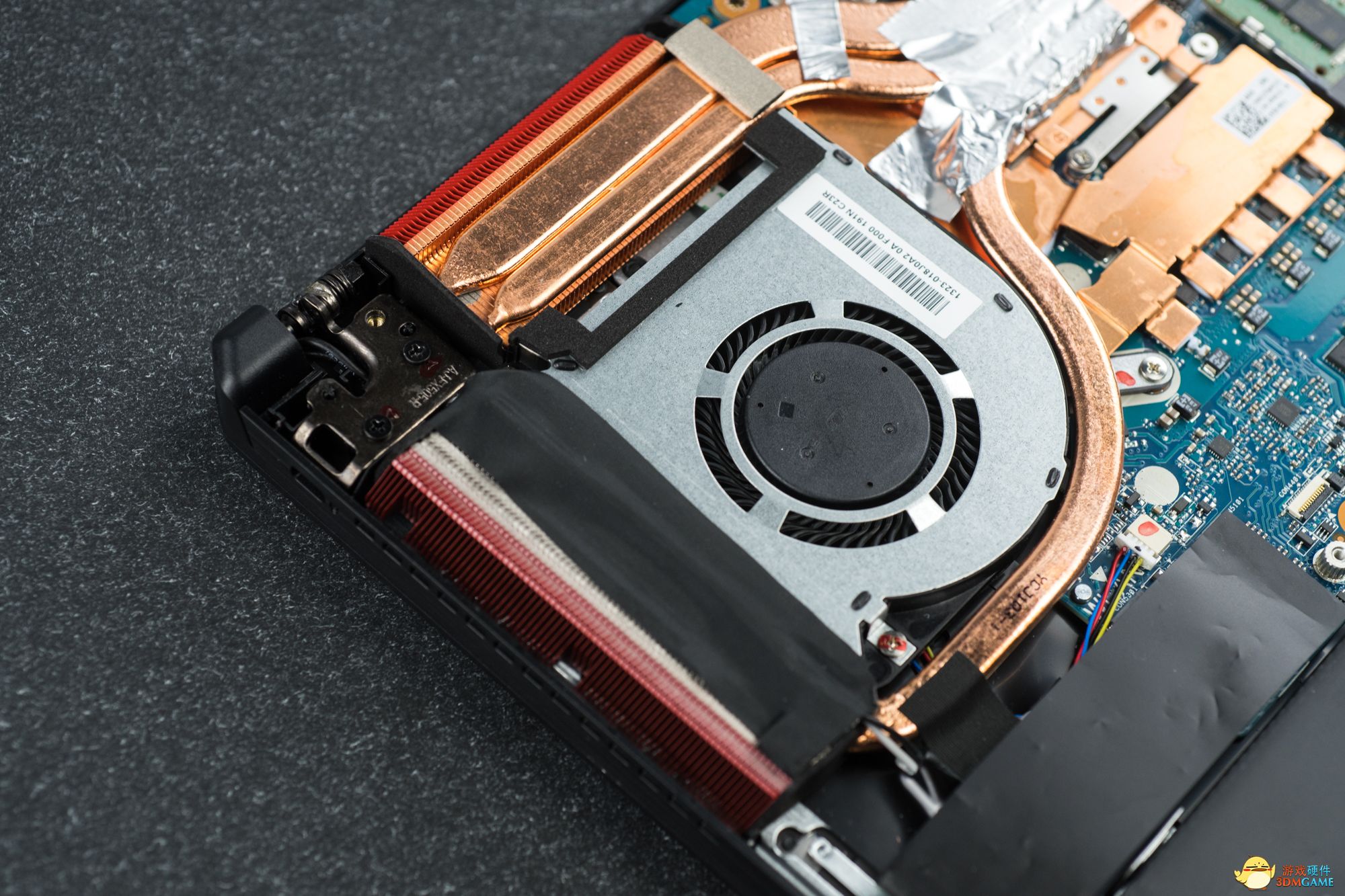 散热部分,飞行堡垒7使用了三根热管加双风扇的设计,左侧风扇有两个出风口,而右侧风扇只通过后侧出风。