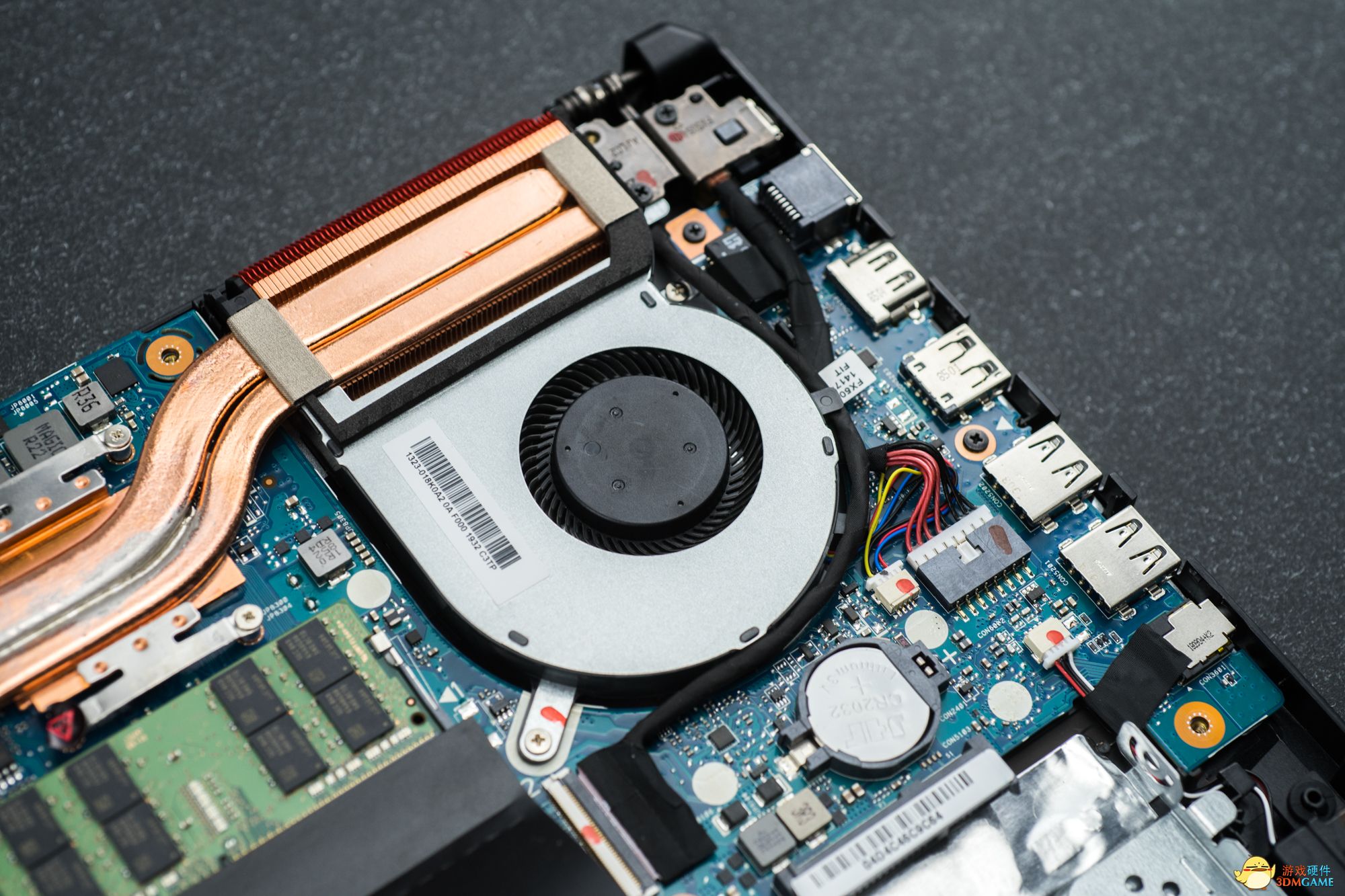 飞行堡垒7的内部几乎可以说是完全沿用了上代产品的设计,增加了一根热管和出风口,散热效果上有所加强。但我们认为还有改进的空间。比如电池右侧到2.5寸硬盘位的中间部分没有安装任何元件,有些空间上的浪费。而接口集中在一侧的设计也有意无意间限制了散热模组再多一个出风口的可能。