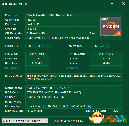 AMD Ryzen 7-3750H是AMD新锐龙家族笔电平台的一颗高端CPU,玩家们可能相对来说比较陌生。这颗处理器基于12nm工艺打造,拥有4核心8线程设计,基础频率2.3GHz,最大加速频率4GHz,搭配的是Radeon RX Vega 10核心显卡。整体热设计功耗为35W。纸面参数上来看整体性能不差,所以接下来我们对CPU部分进行性能测试,来看看AMD的新锐龙到底能不能YES成功。