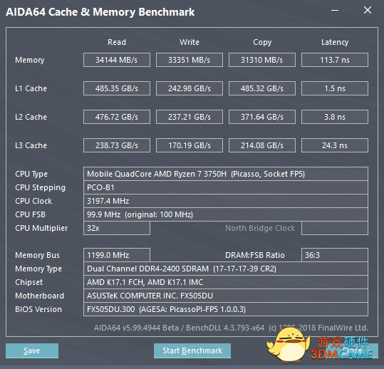 CINEBENCH R15和R20(我们会在数据库相对完整后全部切换到R20软件)成绩分别为782cb和1740cb;同样测试多线程性能的国际象棋相对倍数29.67,每秒千步14241。从单线程和多线程的成绩来看,锐龙R7-3750H的整体性能已经和i5-8300H相差无几,甚至更好一些,并且3750H的TDP也只有35W,功耗情况也表现不错。