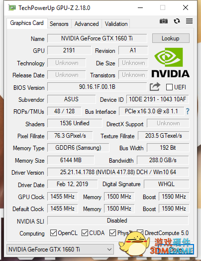 显卡部分,飞行堡垒7搭载了GTX 1660 Ti显卡,这也是我们第一次拿到笔记本平台的GTX 1660 Ti,所以对于它的性能表现是非常期待的。这块显卡基础频率1455MHz,加速频率1590MHz,拥有6GB GDDR6显存。