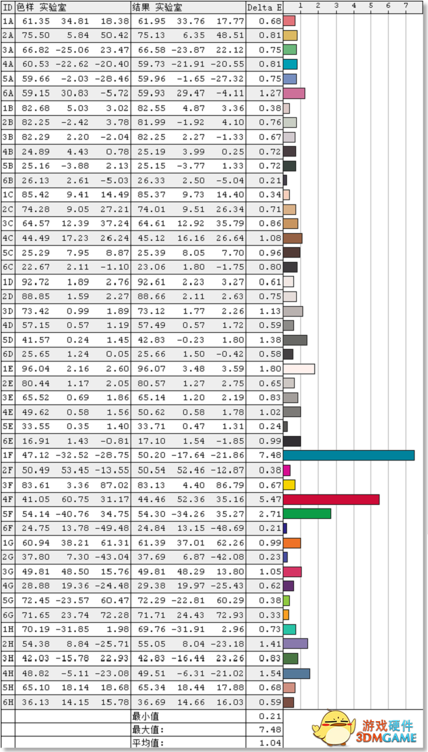 48色色准测试平均色彩偏离1.04,在青色部分偏离最大,但平均下来的色准表现上佳。