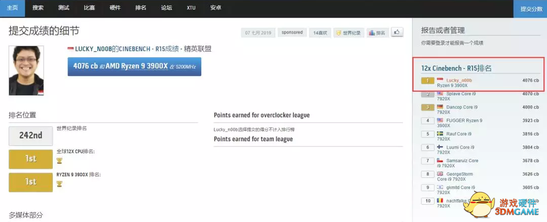 来自印尼的超频选手LUCKY_N00B在CineBench12x组超频比赛中用AMD刚刚解禁的锐龙9 3900X搭配微星 MEG X570 GODLIKE超神主板液氮超频至5.2GHz,并跑出了4076的高分,力压第二名的5.98GHz i9 7920X。