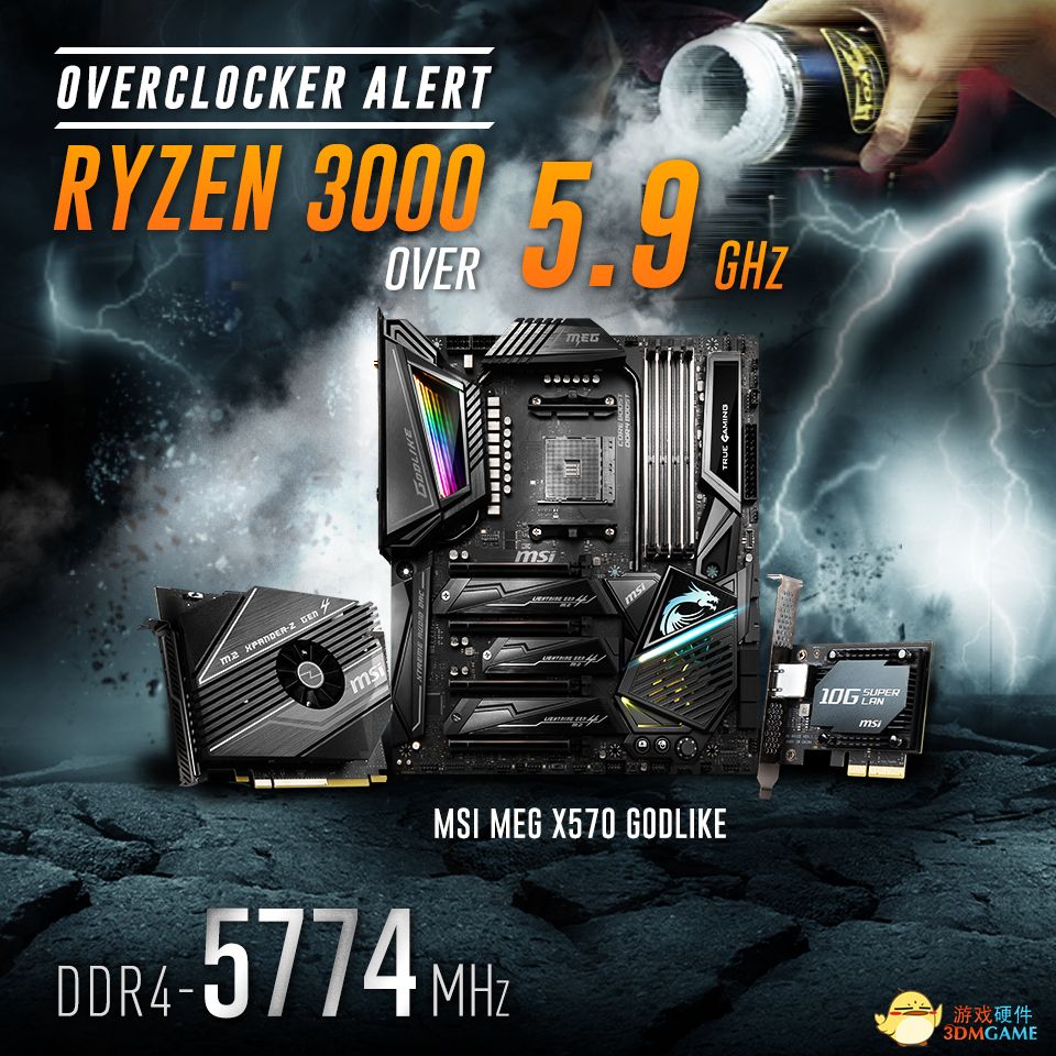 其次是在另外一起超频比赛中选手使用微星MEG X570 GODLIKE超神板将第三代锐龙处理器超频至5.9Ghz,内存频率破5744MHz,再创DDR4频率新高!