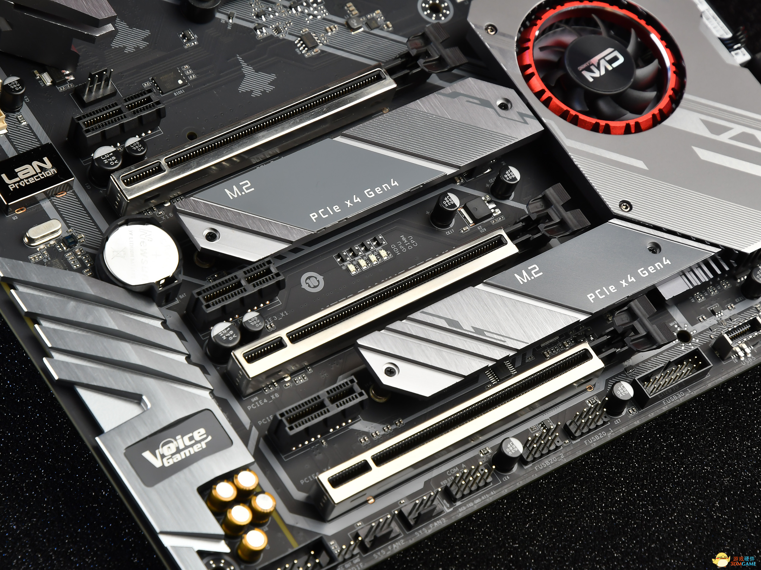 为保证第三代锐龙处理器充分发挥其性能,这款主板在供电上采用10相混合数字供电设计,混合数字供电设计由L.R.T 八脚MOS管、F.C.C铁素体电感、10K黑金固态电容构成。