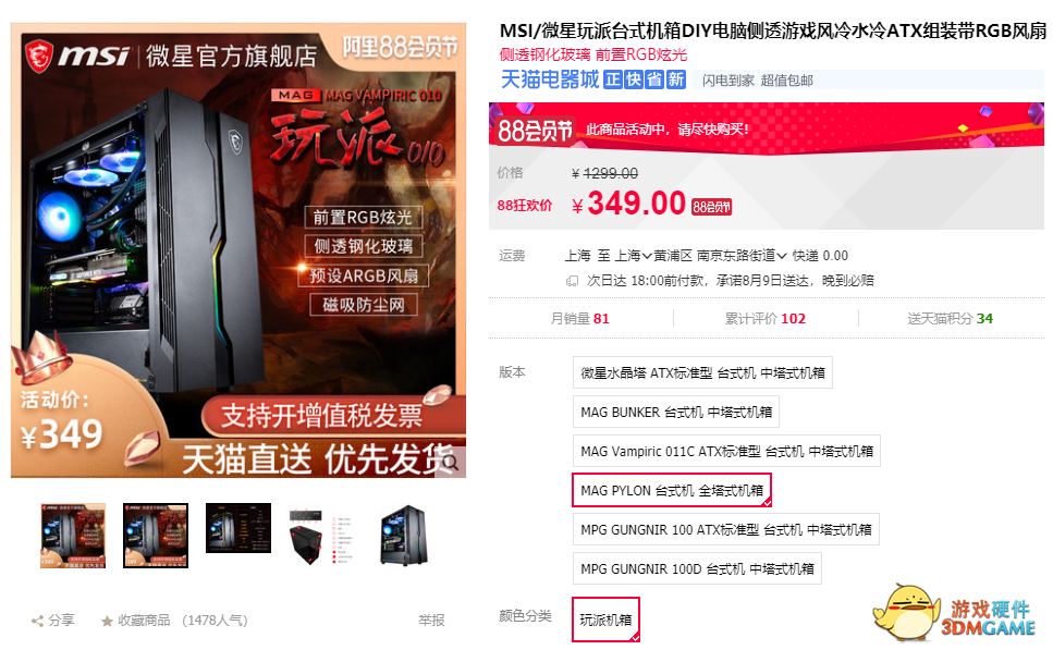 机箱方面,微星旗下前置RGB炫光的爆款机箱玩派更是打出了349元的88狂欢价。