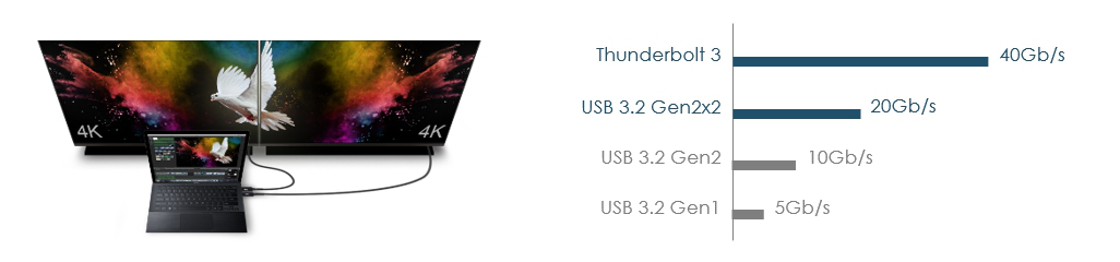 内容创建过程非常耗时,因此数据传输速度是创建者重要的因素之一。 为了满足苛刻的要求,Creator X299配备了包括网络和传输连接在内的疾速解决方案。 双板载LAN(包括一个10G疾速LAN)可确保更高的速度,更好地在短时间内传输4K视频,大尺寸图片和其他大文件。 WiFi 6是全新的无线技术,至多可支持4倍的网络容量和效率。 Thunderbolt 3的速度比USB 3.2快8倍,速度高达40 Gb / s,并为两个同时工作60Hz的4K显示器支持更多的视频带宽,只需一个Type-C连接器即可。