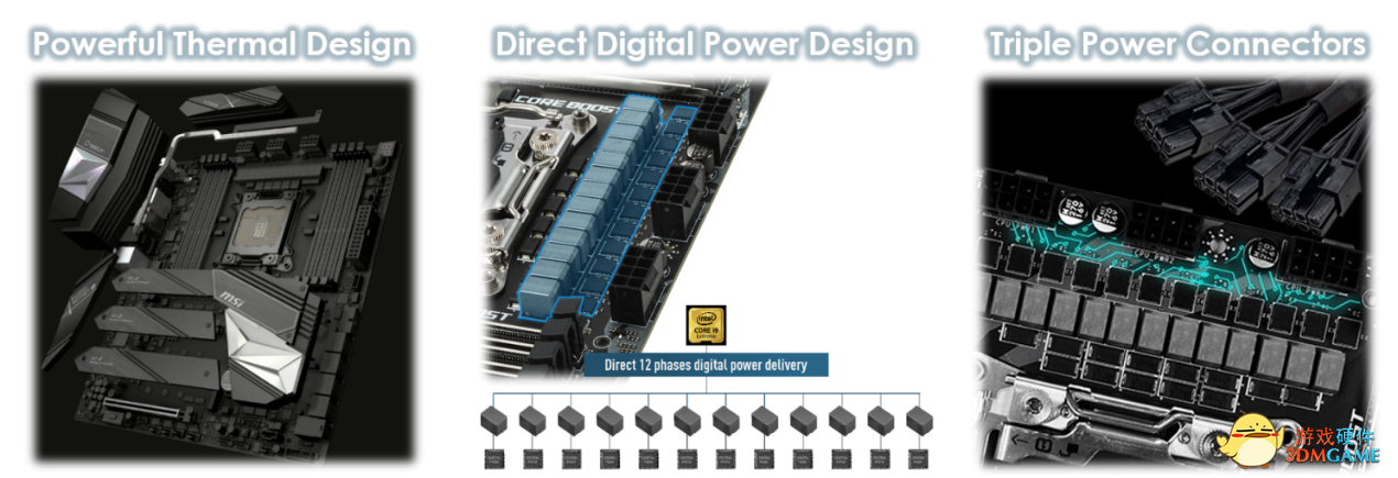 CREATOR X299主板为了能让创作者在处理CPU高负载工作内容时平台能稳定高性能的运行,采用高阶的散热设计,加入了更大尺寸的散热器和全铝的热管设计,并提供了12相90A数字供电。