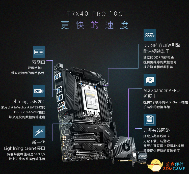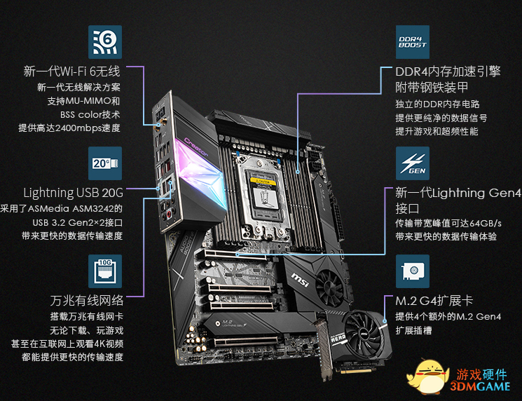 并有DDR4内存加速引擎和CPU核心加速引擎加持,能很大程度的发挥出CPU核心的上佳性能!除此之外,在扩展方面,它还配备了Lightning USB 20G接口(即USB 3.2 Gen2x2)和M.2 G4扩展卡,使得用户可以在这张板子上安装到7个M.2 SSD,满足影视后期工作室庞大的数据存储所需。