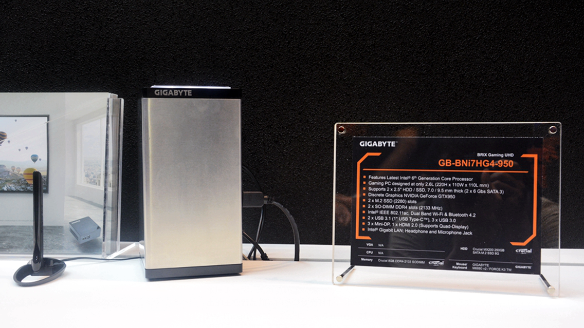 展会现场神秘新品——面向游戏玩家的技嘉BRIX迷你PC套件,不仅可以配备M.2双极速SSD,更是容纳了一张桌面级独立显卡,应对大型3D单机游戏也毫无问题。