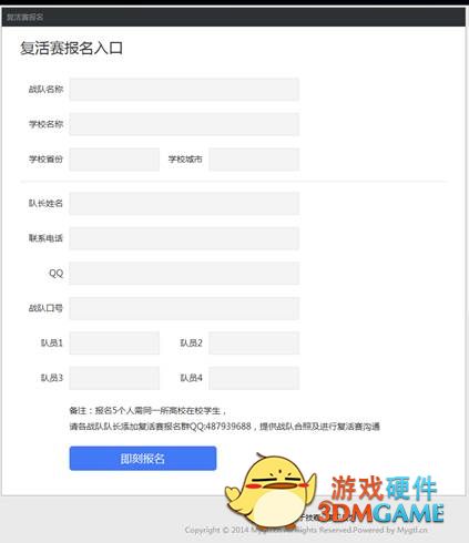 本次复活赛除了之前遗憾被淘汰的战队可以报名外,之前因为种种原因与预选赛擦肩而过的小伙伴们,也可以报名。只要你们是同一所学校的在校学生就可以啦,快叫上小伙伴们一起来吧。报名队伍的5个人一定是同一个学校的(否则技嘉的组委会同学是不会通过的)。另外请报名队伍的队长添加复活赛报名群QQ: 487939688,提供战队合照及进行复活赛沟通,在这个颜值当道的时代,大家上传的照片一定要美美的啊!我们会在投票页面加入照片。 也可以直接QQ群内报名。最重要的信息:报名截止时间为7月21日。