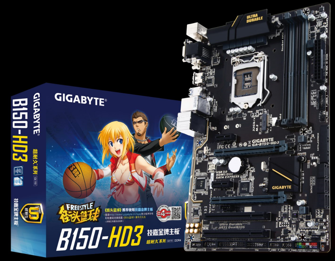 下面是技嘉与《街头篮球》联合打造的B150-HD3彩盒定制主板,B150-HD3采用了标准ATX大板设计,配备了拥有32 Gb/s高速带宽M.2 SSD插槽,支持双路CF多卡交火,四根双通道DDR4内存插槽最高支持到64GB,板载高品质音频电容以及独立音频区设计的音效处理模块,3组高清显示输出接口,LED呼吸灯带。定位清晰,非常适合搭建主流游戏平台。