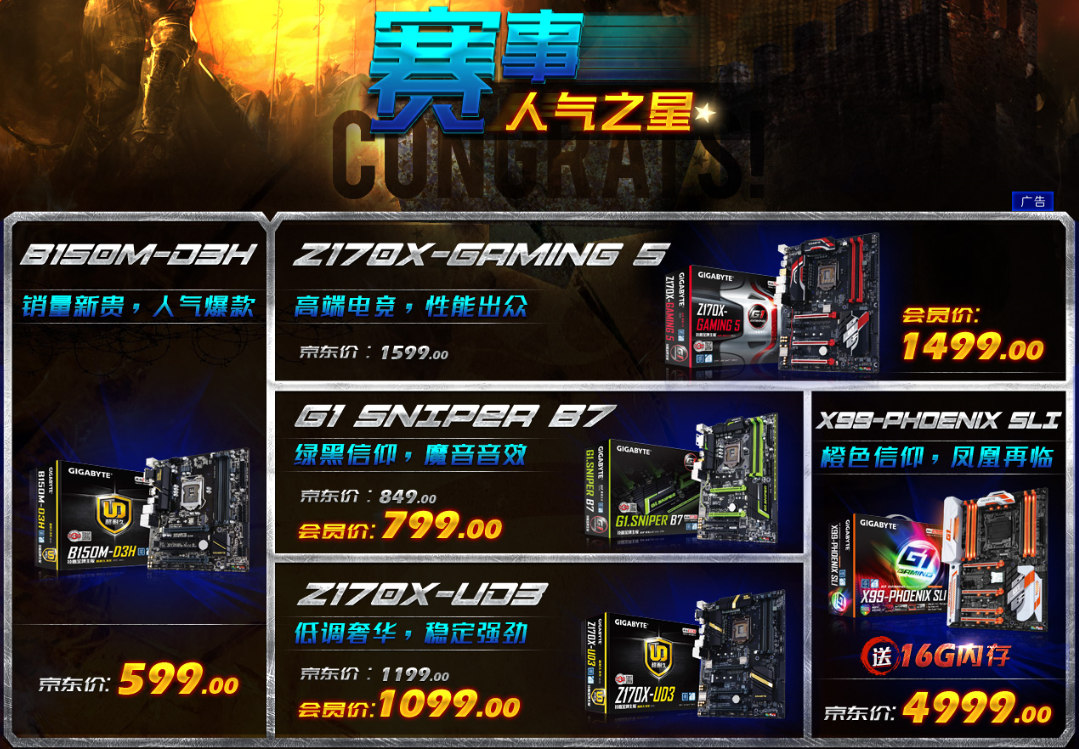 人气爆款、高端电竞主板再次刷新超低会员价,购买指定主板还有16G品牌内存赠送。其中销量新贵Z170X-UD3主板京东会员价仅售1099。高端电竞主板Z170X-Gaming 5京东会员价1499。主流游戏玩家也可选择实力派技嘉G1.Sniper B7以及B150M-D3H主板,性价比更出色。发烧土豪玩家也可以考虑X99-Phoenix SLI 凤凰旗舰主板,活动期间赠送16G内存。