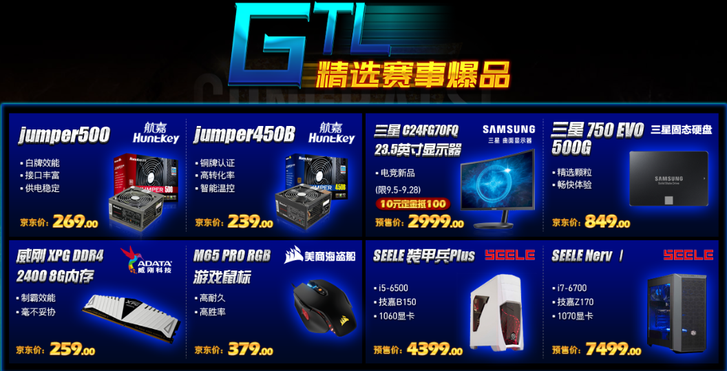 技嘉还特意精选了多款GTL赛事爆品,包括电源、内存条、显示器、机械键盘等攒机必备硬件,也有精心准备的电竞整机供玩家选择,其中SEELE装甲兵Plus以及SEELE Nerv分别采用了技嘉B150、Z170系列主板,性能强劲,价格也很厚道。