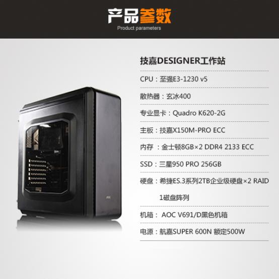 技嘉DESIGNER工作站通过Quadro K620-2G显卡、技嘉X150M-PRO ECC主板、E3-1230 v5处理器、三星950 Pro 256GB NVMe SSD等专业硬件,可让设计师快速提升工作效率,带来顺畅的工作体验。和CREATOR工作站一样,DESIGNER也采用了ECC内存,以及由两块希捷2TB企业级硬盘组建的RAID 1磁盘阵列,可充分保障数据安全,无需担忧磁盘资料意外损坏。