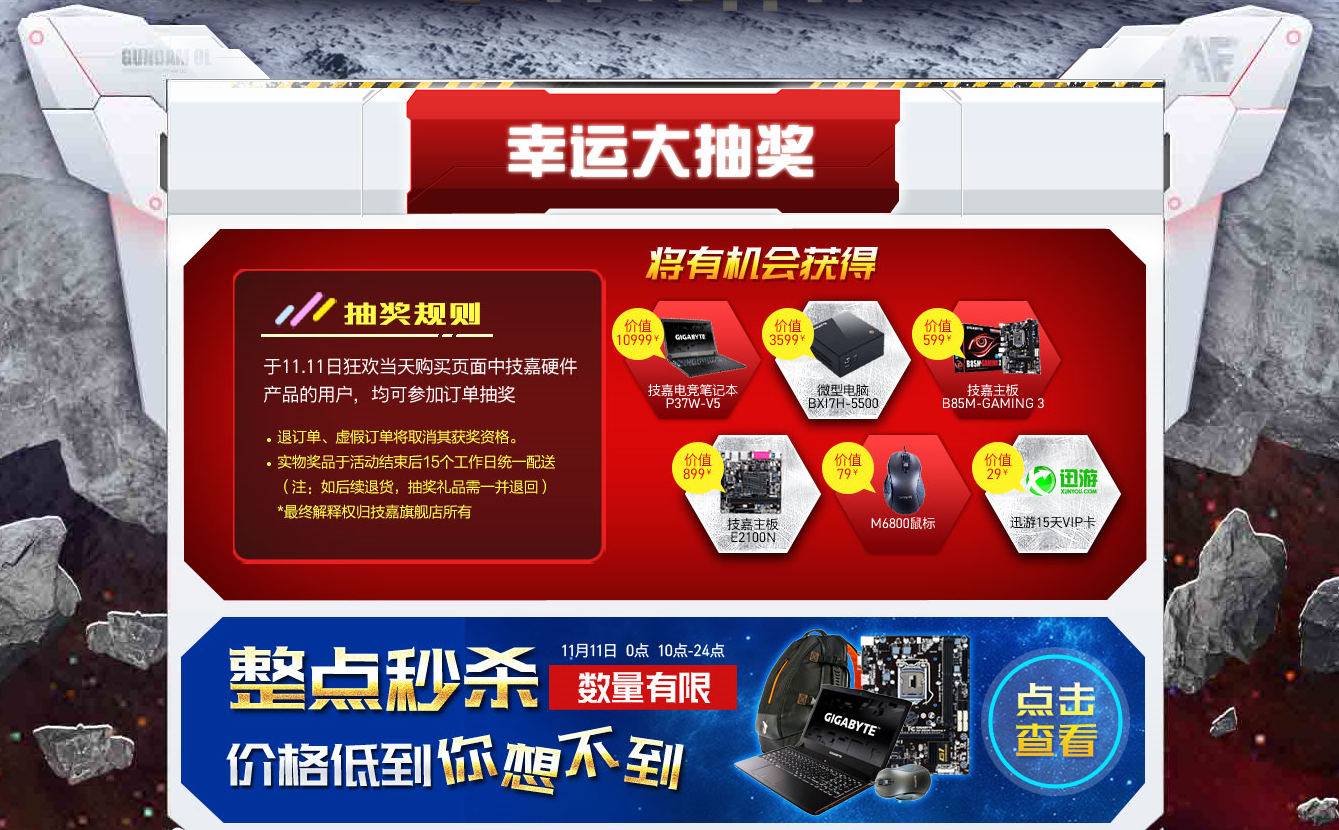 11月11日期间,只要在活动页面购买技嘉硬件,即可参与抽奖!除了头等大奖技嘉P37W-V5专业电竞笔记本外,还有技嘉BRIX微型电脑、B85-Gaming 3游戏主板、M6800游戏鼠标等实用奖品!所有实物奖品,抽中后均需等活动结束后15个工作日统一发送。