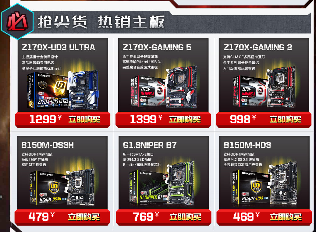 Gaming热销主板Z170X-Gaming 5是款消费级的高规格游戏利器,搭载了Intel原厂USB3.1主控,Killer+Intel双千兆游戏网卡方案以及双高速M.2插槽,其中三条显卡插槽均经过了合金强化,而且大块的散热装甲可以保证平台温度始终保持在最低值,无惧单机大作挑战!技嘉Z170X-UD3-Ultra三十周年纪念主板虽然价格低至1299,但是主板设计和规格配置都不容小觑,蓝白小清新装甲,旗舰级音效芯片、U.2接口、显卡及内存插槽加固都为这款主板加分不少,双十一狂降200多,非常值得入手。性价比之选技嘉B150-HD3超耐久大板接口齐全,扩展性大,高速接口搭配M.2 SSD,速度更快!
