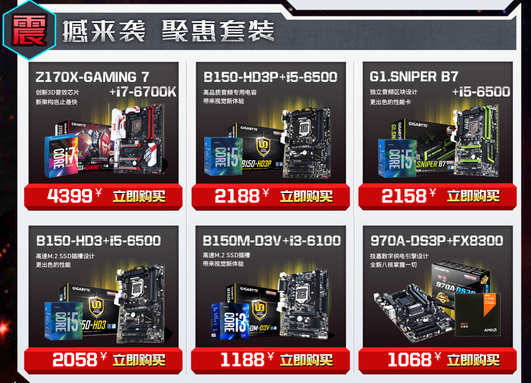 懂点硬件知识的都知道单买不如套餐来的实惠,技嘉Z170X-Gaming 7主打游戏市场,11相CPU供电设计,搭载最新杀手E2400网卡,双极速M.2 SSD插槽,可为玩家提供优秀的游戏体验。搭配i7-6700k处理器更令性能翻一番。现在售价4.5k以内,双十一当天购买还赠送8G内存条!主打性价比的B150M-D3V+i3-6100套餐也是非常值得购买的入门级装备,技嘉B150平台的稳定性加上i3-6100高速运算能力,搭建普通游戏平台还是没压力的,双十一狂欢价仅需1188元!