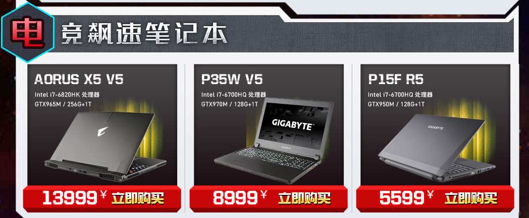技嘉Aorus电竞笔记本主打高性能,其中Aorus X5 V5 搭载了i7-6820HK处理器,内载GTX965M双独显+256G固态硬盘,具备媲美桌面级游戏主机的性能输出。不差钱的高端玩家可以考虑一下。当然也可以选择性价比更高的P15FW R5。