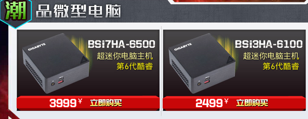 追求精致生活的消费者可以了解一下BRIX超迷你主机,小巧的外型深受玩家喜爱。根据定位不同,性能也有所差异,BSi7HA-6500作为性能担当,搭载第六代酷睿i7处理器,并支持4K高清播放及多屏显示输出,足以应对日常办公娱乐,其强劲的核显性能也可以胜任大部分网游,价格不到4000,仅为普通整机的价格,而购买BSi3HA-6100更低至2499。