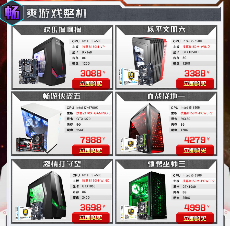整机优惠多,高阶玩家智选“畅游侠盗五”,这款7k超强整机是时下主流的电竞配置,技嘉Z170X-Gaming 3游戏主板搭配i7-6700k处理,再加上GTX 1070发烧级显卡,足够碾压市面主流单机大作。玩家可以根据自己的需求另购整机,价格3k起步,适合自己的才是最好的。