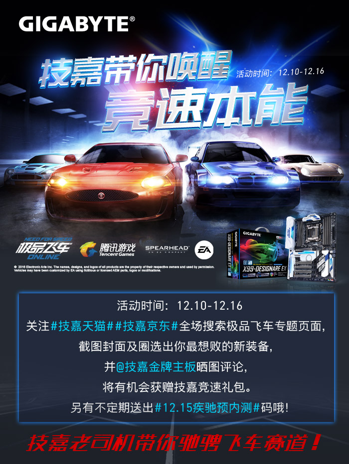 12.10-12.16,参与#技嘉带你唤醒竞速本能#《极品飞车OL》微博活动,登入#技嘉天猫#品牌站或#技嘉京东#自营店全场搜索@极品飞车OL官博 专题页面,截图封面及圈选出你最想败的新装备,并@技嘉金牌主板 晒图评论,将有机会获赠技嘉竞速礼包活动期间每天送出,另有不定期送出#12.15疾驰预内测#码哦,技嘉老司机带你驰骋飞车赛道!