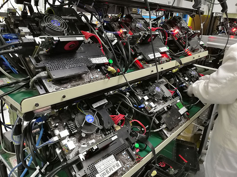 在显卡产线,由于大部分生产过程和主板相似,因此也就没有拍很多照片。图中是刚刚生产出来的微星红龙显卡,可以看到每一张显卡都经过了上机测试,因此我们买显卡时也不要看到金手指有插痕就觉得是二手,毕竟检测一遍总是要插一次的。