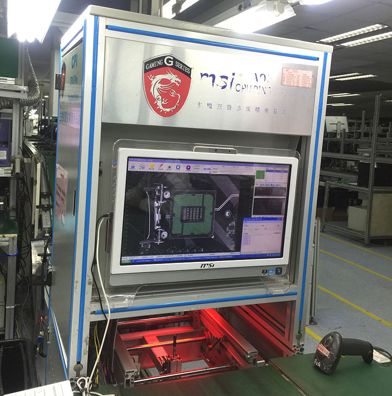 图中就是包装前的最后一步了,这台机器的作用是通过光学仪器检测主板针脚是否正常,并且对每一张出产的主板都进行拍照以确保产品质量万无一失。