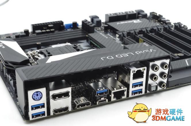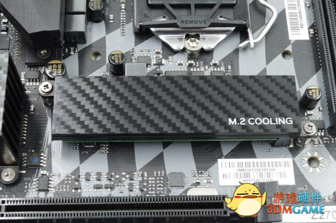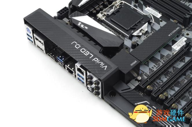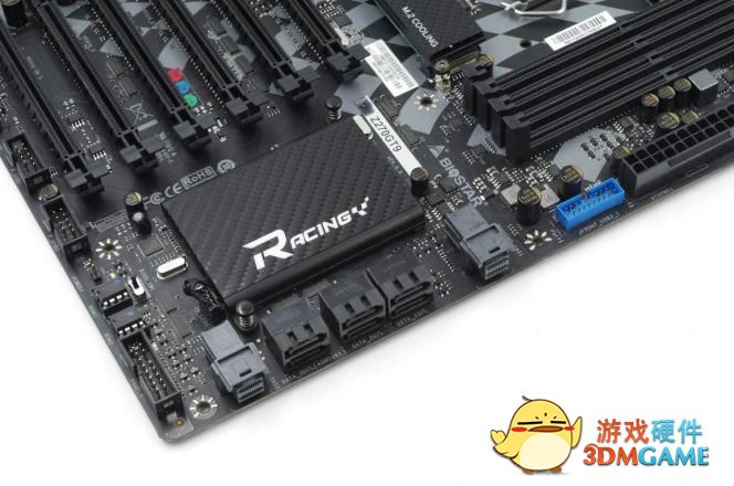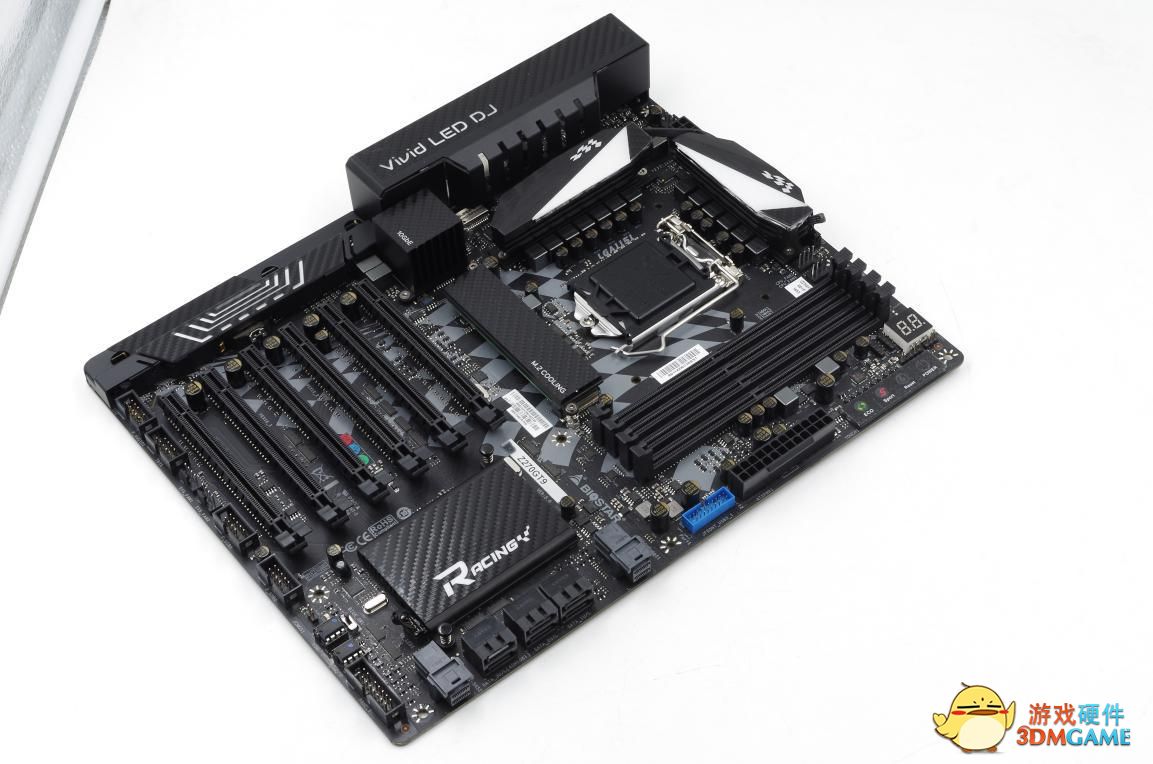 主板的颜值依旧高大上,碳纤维散热模组十分给力,印有RACING LOGO这块碳纤维散热片颜值更得到了提升,内建了一组RGB LED,主板点亮之后更加酷炫。