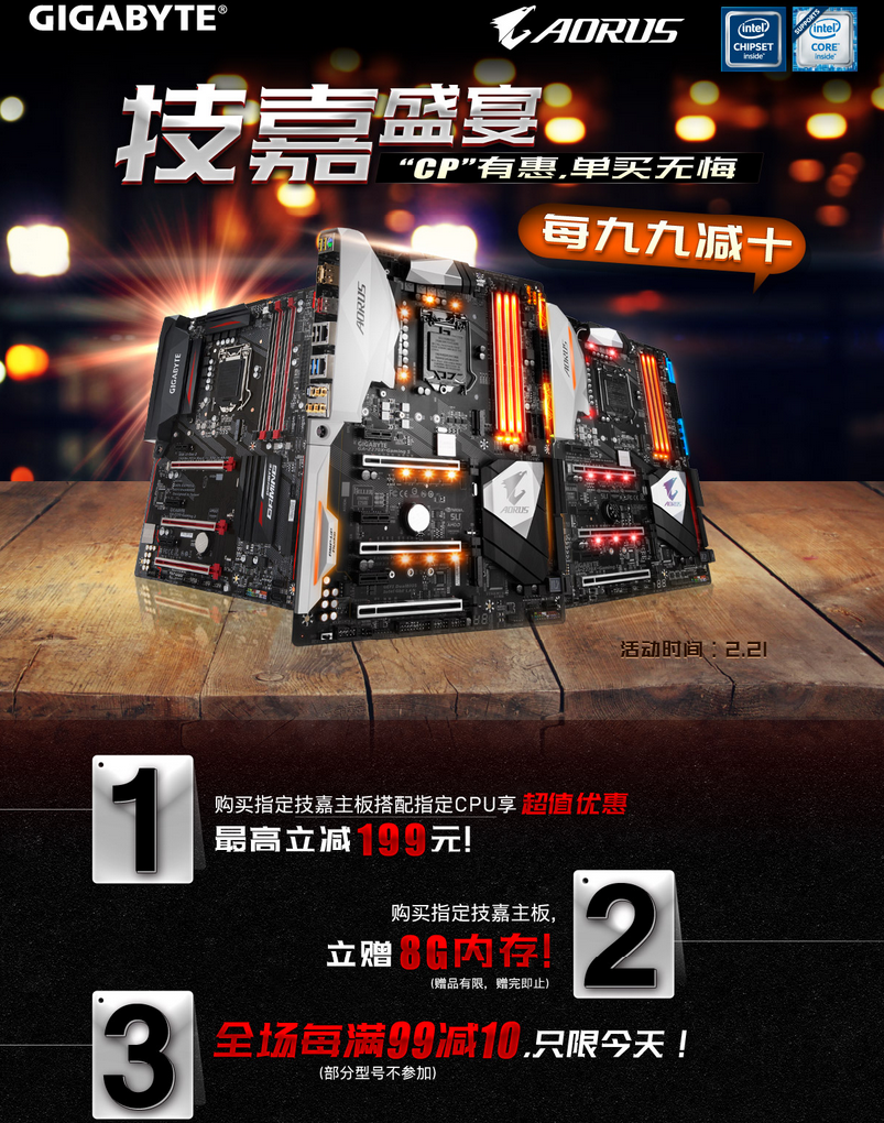 现在参与活动,活动期间享全场每满99减10优惠;购买指定技嘉主板搭配指定CPU还可享超值优惠最高立减199;购买指定技嘉主板立赠8G内存。趁技嘉京东超级品类日大促活动,赶紧给自己换一套新装备吧,飙速竞技,赢在起跑线!