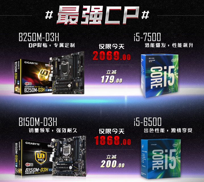 论最强CP,那不得不提技嘉B150M-D3H主板+I5-6500处理器套装。B150M-D3H继承了技嘉超耐久主板优秀的用料品质,内存条方面为标配的双通道DDR4设计,四根内存插槽,最高支持64G;板载高速M.2 SSD插槽,采用PCI-E 3.0 x4通道32 Gb/s高速带宽,高品质音频专用电容、独立音频区块设计,性价比出众,B150系列主板的销量担当实至名归。搭配I5-6500处理器,轻松打造主流游戏平台。当然,预算充足的玩家可以选择B250M-D3H主板+I5-7500处理器套装,性能更上一层楼。