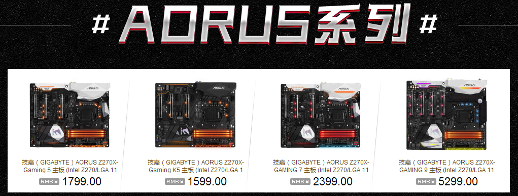 技嘉AORUS Z270X-Gaming 7作为AORUS主板的销量担当,板载杀手专业游戏网卡+Intel千兆双网卡设计,配备了创新3D音效芯片的魔音音效系统,不仅规格配置给力,拓展性也足够强。1680万色炫彩魔光系统以及可更换式镭射雕刻导光条,轻松打造专属个性定制游戏主机。而追求极致体验的发烧友可以选择AORUS Z270X-Gaming 9,这款旗舰超频主板采用了E-ATX大板型,配备了超强22相数字供电,在CPU供电区域配置了与EK合作设计的水冷散热,性能更为强劲,搭载旗舰级的i7-7700K处理器,获得强悍的超频能力。