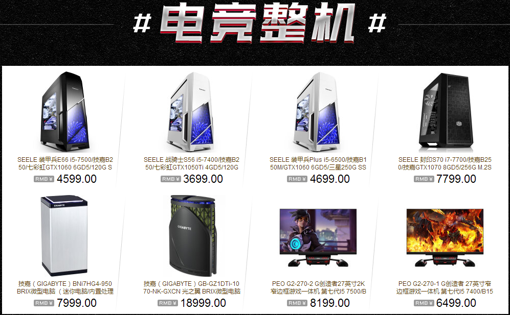 直接入手整机省时省力且相较DIY来说优惠不少。搭载技嘉B150主板和i5-7500处理器以及GTX 1060显卡的创造者27寸窄边框游戏一体机现特价8199,性能强劲外观出色,可畅玩主流游戏大作。此外SEELE 战骑士主机配置也不错,搭载技嘉B20主板及i5-7400处理器、GTX 1050Ti显卡,性价比之选,无论是家用办公还是游戏娱乐都能轻松应对!而追求精致生活的消费者可以了解一下BRIX超迷你主机。定位不同,性能也有所差异。BNi7HG4-950作为颜值和销量担当,搭载第六代酷睿i7处理器,支持4K高清播放及多屏显示输出,并可扩充内存条,性能强劲,现在购入仅需3999,性能足够运行畅爽主流网络游戏。