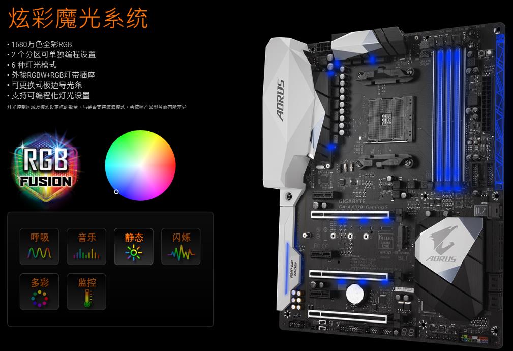 作为技嘉AORUS家族的一员,AORUS AX370-Gaming 5同样板载了1680万色全彩RGB魔光系统,并支持2个分区可单独编程设置,加上外接RGBW灯带插座,配合可更换式板边导光条以及自带的6种不同的灯光模式(呼吸、音乐、多彩、监控等),不需要太多预算也能为玩家打造个性主机。