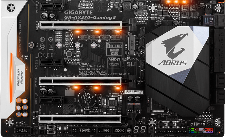 相较上一代AMD旗舰主板,基于X370芯片组设计的AORUS AX370-Gaming 5称得上一个质的飞跃,显卡插槽从PCI-E 2.0升级为PCI-E 3.0。主板原生支持USB 3.1、M.2 、U.2以及SATA-E接口。此外,显卡插槽部分也添加了合金装甲,不仅可以更好地应对高端重型显卡,还为拆卸时的误操作提供额外的保护。