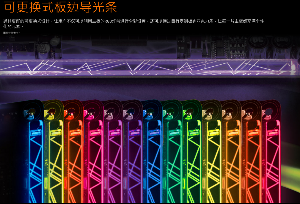 可更换式板边导光条不仅可以利用主板的RGB Fusion软件进行全彩设置,还可以通过自行定制板边亚克力条,让每一片主板都独一无二,真正实现深度定制的个性化装机。
