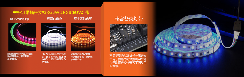主板机箱RGBW灯带插座采用了市场通用的12V直流供电,支持RGBW等多种规格灯带。相比传统的RGB灯带插座,技嘉RGBW灯带插座可实现更准确更纯粹的白色光效。同样支持可编程化的高级设置模式。