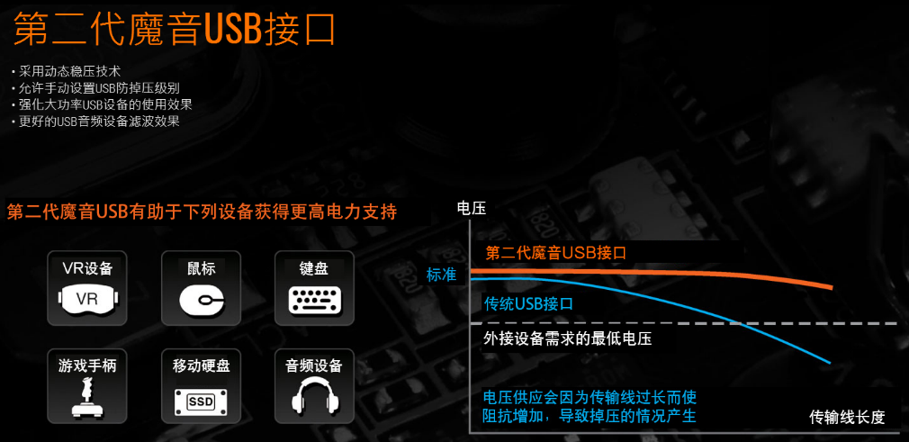技嘉主板在音效处理模块已经有多年的技术积累,这次采用了动态稳压技术的第二代魔音USB接口允许手动设置USB防掉压级别,能强化大功率USB设备的使用效果。搭配时下流行的VR头盔、游戏手柄能有一个更出色且稳定的电力支持。