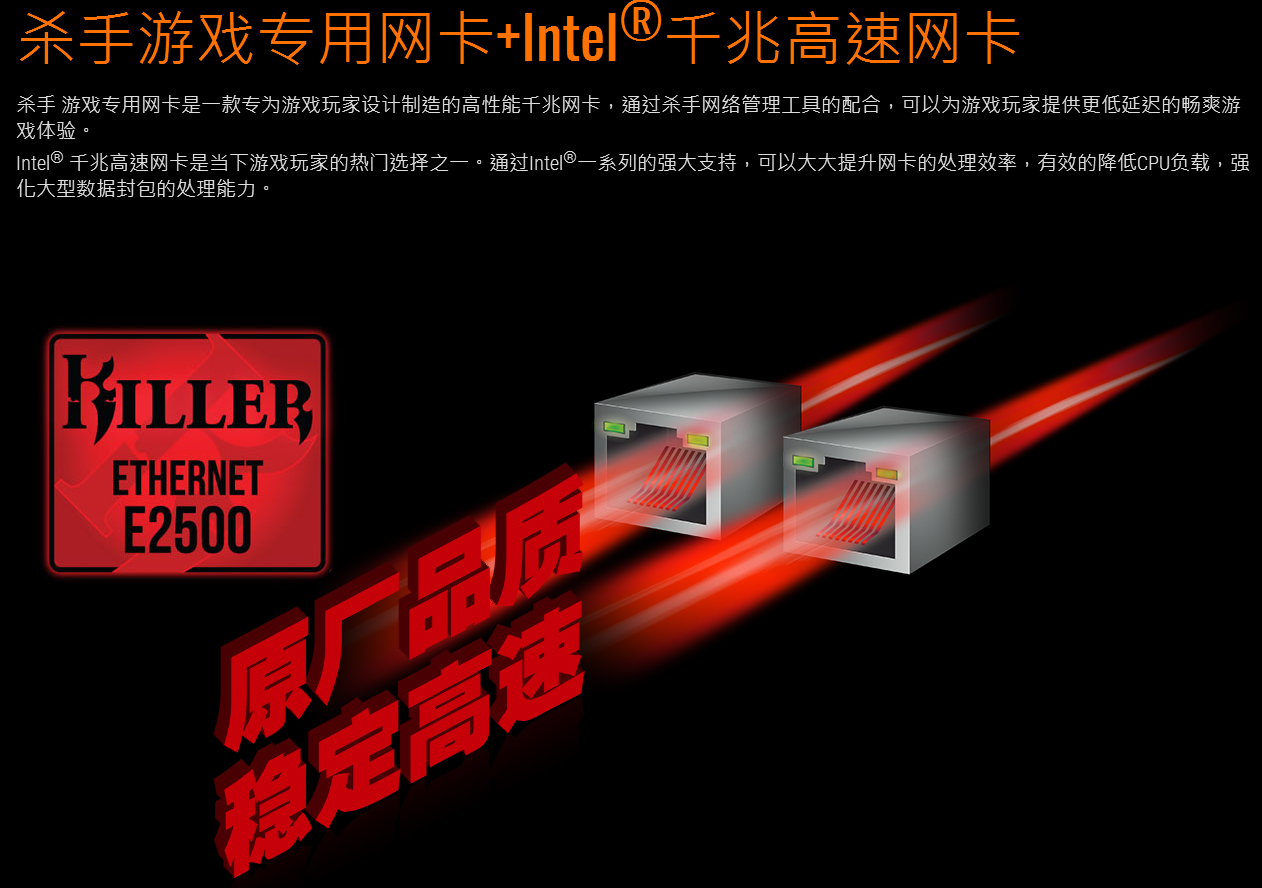 网络优化一直是游戏主板的重要一环,技嘉AORUS AX370-Gaming 5采用了杀手游戏专用网卡+Intel千兆双高速网卡设计,配合强大的网络管理工具,可为玩家提供更低延迟的顺畅游戏体验。告别卡顿,轻松上分。