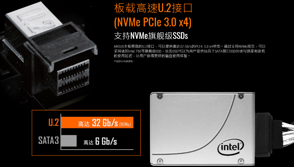AORUS AX370-Gaming 5搭载的U.2接口,可以提供高达32 Gb/s的PCI-E 3.0 x4带宽。通过支持NVMe规范,可以采用诸如Intel 750等旗舰级SSD,这些SSD可以为用户提供远高于SATA接口SSD的读写速度和更低的使用延迟,让用户获得更好的磁盘使用体验。