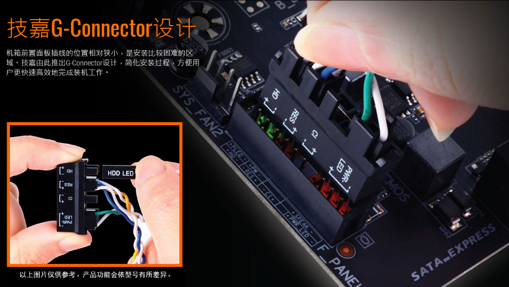 机箱前置面板插线的位置相对狭小,是安装比较困难的区域。技嘉由此推出了贴心的G-Connector设计,简化了跳线安装过程,方便玩家更快速高效地完成装机工作。