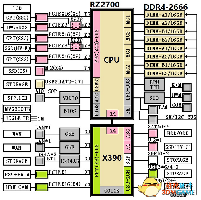 Intel颤抖吧!AMD X390/X399芯片组曝光:真发烧X390规格图,可以看到还是双通道内存控制器,支持DDR4-2666,最大容量可达128GB(八条16GB)。