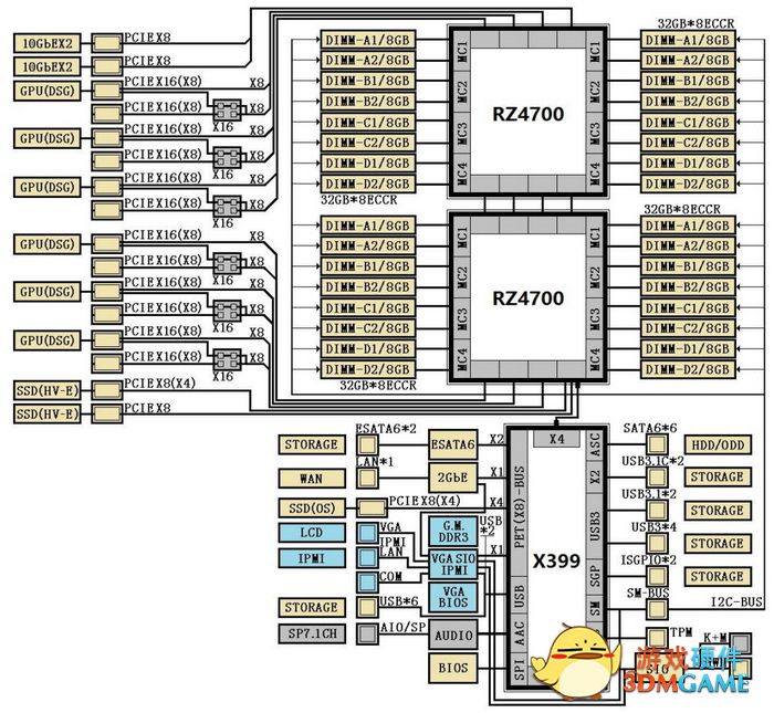 同时,PCI-E通道总计有多达44条,可以为多显卡、M.2固态硬盘、网卡提供足够的带宽,这甚至比Intel X99平台还要多,后者也才40条。