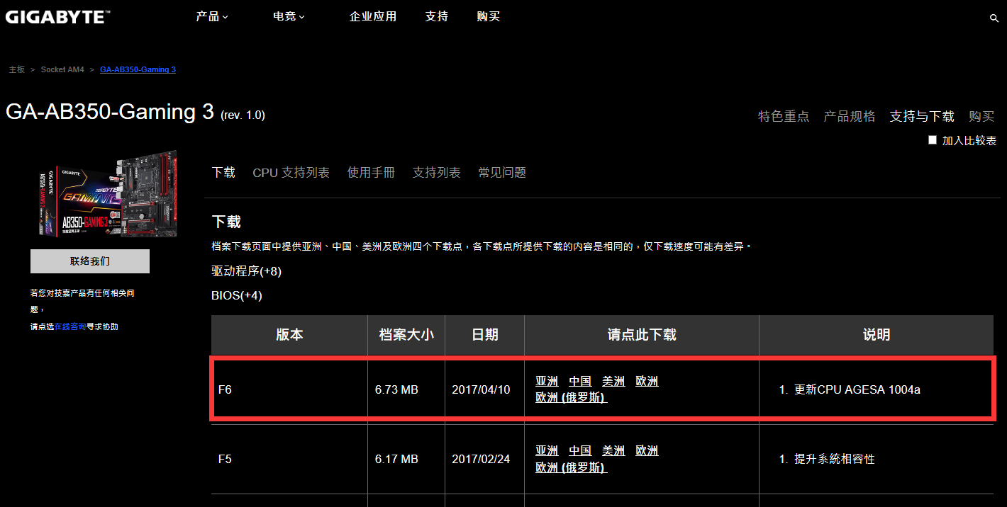 技嘉AB350-Gaming 3最新BIOS下载链接:http://www.gigabyte.cn/Motherboard/GA-AB350-Gaming-3-rev-10#support-dl